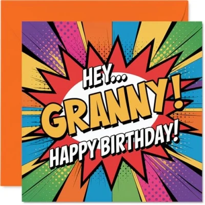 Playful Birthday Card for Granny Bursting with Cheer Vibrant Comic style Design Bold HEY... GRANNY! Text 145mm Square, Envelope Included