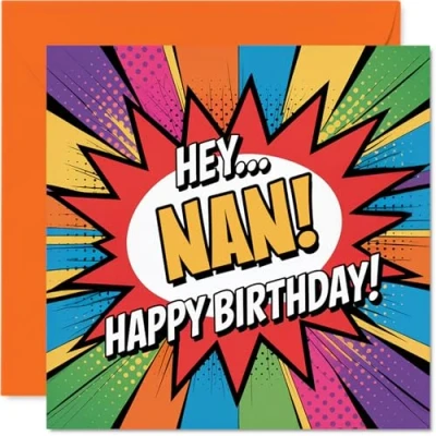 Delivers a real spark of joy with its energetic comic-style explosion and bright colours, making Nan's birthday feel extra special. Birthday card for Nan with a light-hearted design style Features a lively, eye-catching design with bold 'HEY.. NAN! HAPPY BIRTHDAY!' text for a playful, modern twist. Recyclable and printed in UK for a considerate choice Printed on high quality gloss board with an uncoated inside for easy writing - no smudging when writing inside. Printed on 360 micron stock for a confident, premium feel Blank inside so you can add your own personal message, plus comes with a coordinating envelope for a neat finish. The 145mm Square format is convenient to display or post Proudly made in the UK using FSC-certified and recyclable materials - crafted to delight and impress. Printed in the UK. A thoughtful choice that helps you send smiles and warm wishes