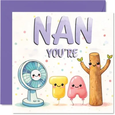 Captures a joyful spirit with adorable cartoon characters and a bold 'NAN YOU'RE' headline. It's a card that brings instant smiles and a warm, affectionate touch Features playful, cute illustrations in pastel purple tones - a fun and whimsical design that stands out on any mantelpiece or celebration table Printed on quality gloss single sided board with an uncoated inside. No smudging when writing inside, so your personal message stays looking sharp Blank inside, giving you all the space you need to share a heartfelt note or cheeky message. Comes with a matching envelope for easy gifting Proudly made in the UK using FSC-certified and recyclable materials, so you can celebrate Nan while being kind to the planet. Printed in the UK