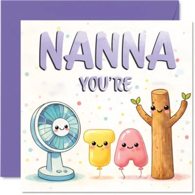 Delivers a joyful message with its playful characters and a big. bold 'NANNA YOU'RE' on the cover. guaranteed to add a dash of fun to her special day Features a charming design with adorable, whimsical figures set against gentle pastel tones, making it a delightfully eye-catching choice. Recyclable and printed in UK for a considerate choice Printed on quality gloss board with an uncoated interior - no smudging when writing inside. Lovingly made using FSC-certified card and fully recyclable Blank inside for your own heartfelt message. Comes complete with a coordinating envelope, ready for gifting. The 145mm Square format is convenient to display or post Designed and printed in the UK, this card stands out for its originality and feel-good touch - a lovely way to brighten. Nanna's celebrations