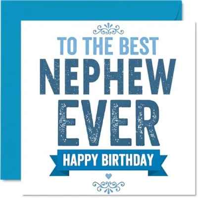 Full of energy and affection, this card's bold 'TO THE BEST NEPHEW EVER' message sets a fun tone that will make his birthday extra special. Birthday card for Nephew with a light-hearted design style Features a striking blue and white design with large, playful lettering that stands out and feels just right for family birthdays. Recyclable; printed in UK for a considerate choice Printed on quality gloss single sided board with an uncoated inside - no smudging when writing inside and easy to personalise your message. Printed on 360 micron stock for a confident, premium feel Blank inside so you can craft your own heartfelt or cheeky birthday wishes. Includes an envelope for hassle-free gifting. The 145mm Square format is convenient to display or post Designed and printed in the UK using FSC-certified - you can count on a card that's both cheerful and responsibly made. A thoughtful choice that helps you send smiles and warm wishes