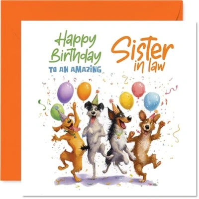 Playful Birthday Card for Sister in Law Four Party loving Dogs and Confetti Bright, Festive Illustration 145mm Square, Envelope Included