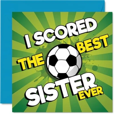 Celebrates your sister's big day with a playful football twist - the bold 'I SCORED THE BEST SISTER EVER' message makes her feel like a true winner Standout design features a lively green pitch. classic black and white football, and energetic pops of yellow. sure to please any sports fan Crafted on gloss single sided board with an uncoated inside, making it easy to pen your own heartfelt message - no smudging when writing inside Blank inside for your personal touch, and comes complete with a matching envelope for easy gifting. The 145mm Square format is convenient to display or post Designed and printed in the UK on FSC-certified; fully recyclable for a feel-good, quality finish you can trust. A thoughtful choice that helps you send smiles and warm wishes