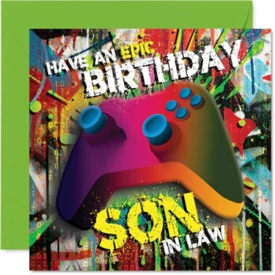 Brings a burst of playful energy with its vibrant gaming controller and graffiti-style background, making birthdays feel like a real-life bonus round Striking multicolour design suits any gaming enthusiast, capturing the spirit of those late-night sessions and cheeky high scores. Recyclable and printed in UK for a considerate choice Crafted from gloss single sided board with an uncoated inside for easy writing. No smudging when writing inside - perfect for your heartfelt or banter-filled message Blank inside to let you add your own legendary birthday wishes. Comes complete with a matching envelope for easy gifting. The 145mm Square format is convenient to display or post Designed and printed in the UK using FSC-certified and fully recyclable materials. Created to help you deliver a smile with confidence. A thoughtful choice that helps you send smiles and warm wishes