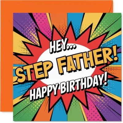 Packed with playful energy, this card's vibrant comic burst and big 'HEY.. STEP FATHER!' greeting set a fun, celebratory tone right from the front Showcases a dynamic explosion motif in multicolour and orange, giving your message some real pop and making it stand out on the mantelpiece. Recyclable and printed in UK for a considerate choice Printed on quality gloss single sided board, with an uncoated inside for easy writing. No smudging when writing inside, so your words stay crisp Blank inside, giving you loads of space for your own birthday wishes, stories or jokes. Comes complete with a matching envelope for a polished finish Designed and printed here in the UK on FSC-certified. Fully recyclable and made to help you bring a bit of extra sparkle to his special day