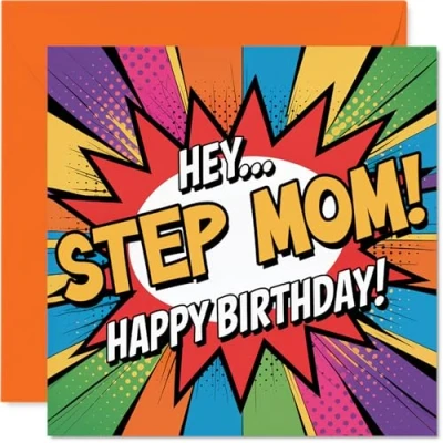Packed with playful energy, this card's bright comic style and standout orange hues create a celebratory mood that's bound to raise a smile. Birthday card for Step Mom with a light-hearted design style Features a bold pop-art motif with dynamic multicolour details, making your step mum's birthday feel extra fun and memorable. Recyclable and printed in UK for a considerate choice Printed on quality gloss board with an uncoated inside, so there's no smudging when writing inside-your message stays as sharp as your wit. Printed on 360 micron stock for a confident, premium feel Blank inside for your own words and wishes. Comes with a matching envelope, making it easy to pop in the post or hand deliver. The 145mm Square format is convenient to display or post Proudly made in the UK from FSC-certified, recyclable materials-because thoughtful design and planet-friendly choices go hand in hand. Printed in the UK