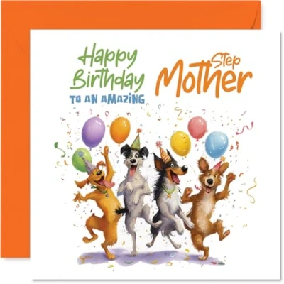 Packed with cheerful energy, this card stars four adorable dogs letting loose with balloons and confetti for a playful birthday vibe. Birthday card for Step Mother with a light-hearted design style The fun party design pops with bright orange and multi-colour details, making it stand out amongst the usual cards. Recyclable and printed in UK for a considerate choice Printed on glossy single-sided board and uncoated inside for a premium feel. No smudging when writing inside. Printed on 360 micron stock for a confident, premium feel Blank inside so you can add your own thoughtful message. Includes a quality envelope for easy gifting. The 145mm Square format is convenient to display or post Designed and printed in the UK on FSC-certified recyclable - a joyful choice you can feel good about. A thoughtful choice that helps you send smiles and warm wishes