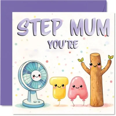 Delightfully playful and cheerful, this card features lovable cartoon characters that bring an instant smile and a dash of fun to her celebration The standout design uses soft pastel and purple shades, with cute characters and bold 'STEP MUM YOU'RE' lettering that pops on the front. Recyclable and printed in UK for a considerate choice Printed on gloss single sided board with an uncoated inside for easy writing. No smudging when writing inside, making your message look its best Blank inside, so you can add your own heartfelt or cheeky note. Comes with an envelope, ready for gifting straight away. The 145mm Square format is convenient to display or post Made responsibly in the UK with recyclable, FSC-certified. Designed to spread joy while being kind to the planet. Printed in the UK. A thoughtful choice that helps you send smiles and warm wishes