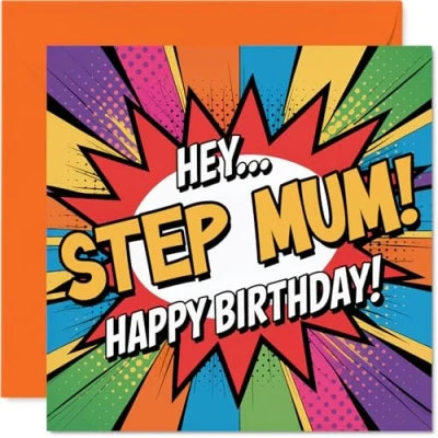 Packed with playful vibes, this card's bold 'HEY.. STEP MUM! HAPPY BIRTHDAY!' shout-out is guaranteed to put a grin on her face. Birthday card for Step Mum with a light-hearted design style Standout motif features eye-catching comic-style graphics in dynamic, multicolour shades that make the celebration pop. Recyclable and printed in UK for a considerate choice Printed on glossy single-sided board with a smooth, uncoated inside-no smudging when writing inside. Crafted using FSC-certified, recyclable materials Blank inside for your own personal message and comes complete with a matching envelope for that polished finishing touch. The 145mm Square format is convenient to display or post Designed and printed in the UK, this card brings cheerful quality and a smile-worthy finish to your birthday wishes. A thoughtful choice that helps you send smiles and warm wishes