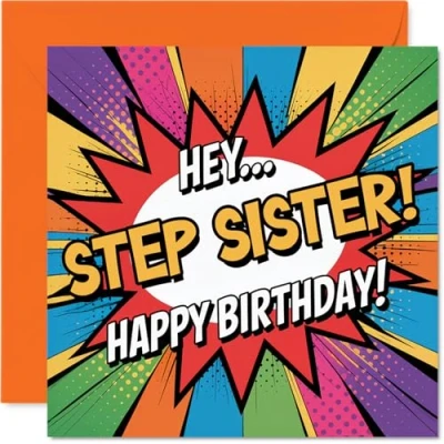Packed with lively comic-book style, this card brings a cheeky, upbeat vibe to any birthday and gets noticed with its bold 'HEY.. STEP SISTER!' greeting Vibrant multicolour motif with punchy orange accents and playful text makes the design pop - an eye-catching choice for fun-loving step sisters Printed on quality gloss single sided board with an uncoated inside, offering a premium feel and plenty of space for your own message. No smudging when writing inside Blank inside so you can add your own personal touch. Comes complete with an envelope for easy gifting. The 145mm Square format is convenient to display or post Designed and printed in the UK using FSC and recyclable materials, so you can celebrate in style and feel good about it. A thoughtful choice that helps you send smiles and warm wishes