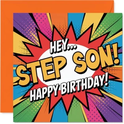 Hits just the right playful note with its bold 'HEY.. STEP SON!' shout-out in classic comic style - perfect for putting a grin on his face. Birthday card for Step Son with a light-hearted design style Features a fun, multicoloured design with a vibrant orange pop that stands out from the crowd and feels full of energy. Recyclable and printed in UK for a considerate choice Printed on quality gloss single sided board with an uncoated inside for easy writing. No smudging when writing inside, so your message stays neat Blank inside for your own birthday wishes and personal touch. Comes complete with an envelope for easy gifting. The 145mm Square format is convenient to display or post Designed and printed in the UK using recyclable materials and FSC - a card you can feel good about giving. A thoughtful choice that helps you send smiles and warm wishes