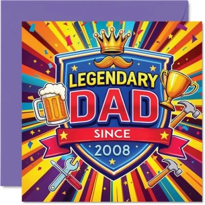 Brings a smile with its playful 'LEGENDARY DAD SINCE 2008' slogan, making it perfect for showing off his status. The bold trophy motif really lets him know he's a winner Features a vibrant mix of blue, yellow, red, and purple, with cheerful tools and trophy artwork for a lively, standout look he'll love. Recyclable and printed in UK for a considerate choice Printed on quality gloss single sided board with an uncoated inside. No smudging when writing inside so your message stays neat and personal Blank inside for your own words, giving you space to add a personal touch or even a joke just for him. Envelope included for easy gifting. The 145mm Square format is convenient to display or post Designed and printed in the UK using FSC-certified, recyclable. Created to make dads, friends or colleagues feel celebrated and appreciated