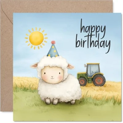 Sure to raise a smile with its cheeky sheep rocking a party hat and plenty of sunny charm on the front. Birthday card with a light-hearted design style Features a playful farmyard design, complete with a jolly tractor and pastel fields for a truly joyful look. Recyclable and printed in UK for a considerate choice Printed in the UK on gloss single sided board - uncoated inside for easy writing. No smudging when writing inside. Printed on 360 micron stock for a confident, premium feel Blank inside, so there's plenty of room for your own special message. Includes a matching envelope for easy gifting. The 145mm Square format is convenient to display or post Designed with care to brighten anyone's birthday; ideal for a friend, colleague, mum or dad who loves a bit of countryside fun