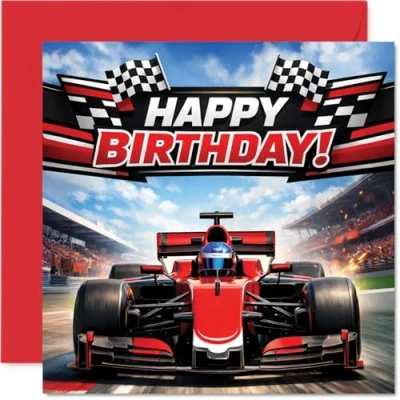 Brings a burst of excitement to any birthday, featuring a lively red race car dashing past bold checkered flags for a winning celebration. Birthday card with a light-hearted design style The energetic race car motif is paired with classic racing details, making it a great pick for anyone who loves fast cars or motor racing. Recyclable and printed in UK for a considerate choice Crafted on a gloss single sided board with an uncoated inside-no smudging when writing inside-offering a smooth, high-quality feel. Printed on 360 micron stock for a confident, premium feel Blank inside, so you can pen your own personal birthday wishes. Includes a matching envelope for an easy finish. The 145mm Square format is convenient to display or post Made in the UK with recyclable materials and FSC certified -giving you quality and sustainability you can trust