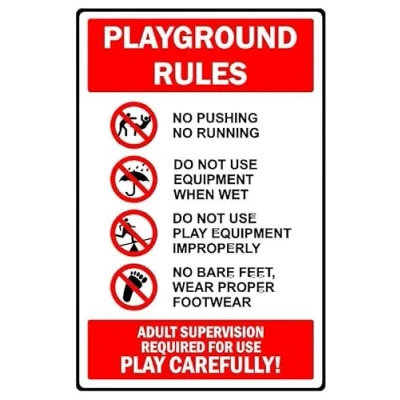 Playground rules prohibition sign. 1mm flexible Plastic sign. Digitally printed for extra durability. Drill and screw in position or use double sided tape to mount onto suitable surface. All signs come with a 5-year warranty. All our signs are UV resistant meaning they will not fade in sunlight. Suitable for indoor & outdoor use.