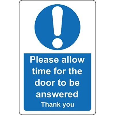 Please allow time for the door to be answered sign Self adhesive sticker Digitally printed and laminated for extra durability Remove backing film and apply to dry, smooth, oil free surface.