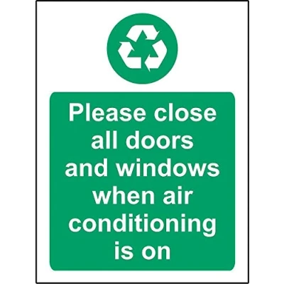 Please close all doors and windows when air conditioning is on Safety sign Self adhesive sticker 150mm x 100mm Digitally printed and laminated for extra durability Remove backing film and apply to dry, smooth, oil free surface.