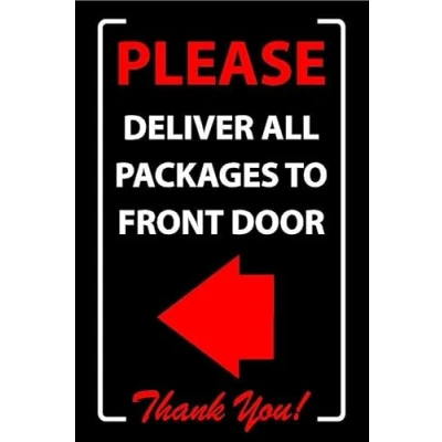Please deliver all packages to front door, left pointing arrow sign. 1mm flexible Plastic sign. Digitally printed for extra durability. Drill and screw in position or use double sided tape to mount onto suitable surface. All signs come with a 5-year warranty. All our signs are UV resistant meaning they will not fade in sunlight. Suitable for indoor & outdoor use.