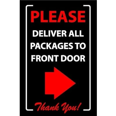 Please deliver all packages to front door, right pointing arrow sign. 1mm flexible Plastic sign. Digitally printed for extra durability. Drill and screw in position or use double sided tape to mount onto suitable surface. All signs come with a 5-year warranty. All our signs are UV resistant meaning they will not fade in sunlight. Suitable for indoor & outdoor use.