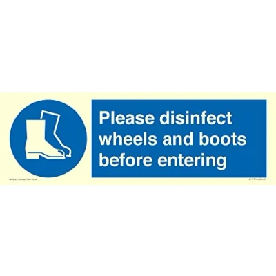 Please disinfect wheels and boots before entering Sign 300x100mm L31