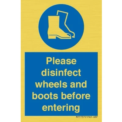 Please disinfect wheels and boots before entering Sign 50x75mm A8P