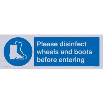 Please disinfect wheels and boots before entering Sign 600x200mm L62