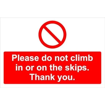 Please do not climb in or on the skips, prohibition sign Self adhesive sticker (400mm x 300mm)