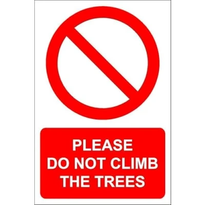 Please do not climb the trees. Self adhesive sticker. Printed using the latest digital technology and laminated for extra durability. Remove backing film and apply to dry, smooth, oil free surface. All signs come with a 5-year warranty. All our signs are UV resistant meaning they will not fade in sunlight. Our vinyl stickers are temperature resistant from -40°C to +80°C.