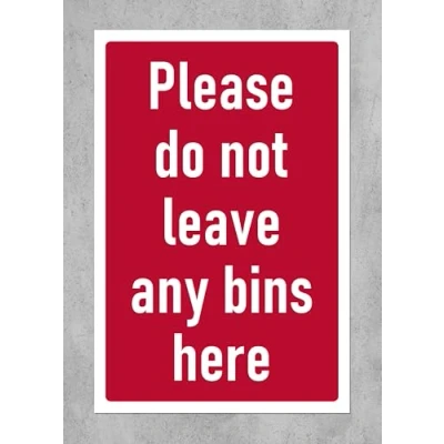 Please do not leave any bins here, safety sign. Self adhesive sticker. Printed using the latest digital technology and laminated for extra durability. Remove backing film and apply to dry, smooth, oil free surface. All signs come with a 5-year warranty.