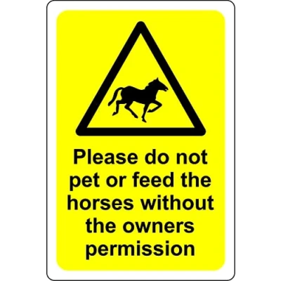 Please do not pet or feed the horses without the owners permission Safety sign 1mm Plastic sign Digitally printed for extra durability Drill and screw in position or use double sided tape to mount onto suitable surface.