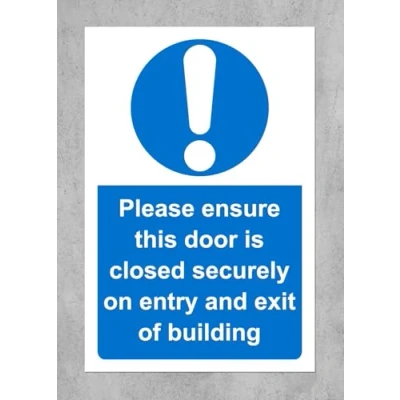 Please ensure door is securely closed on entry and exit safety sign 1mm Plastic sign Digitally printed and laminated for extra durability Drill and screw in position or use double sided tape to mount onto suitable surface