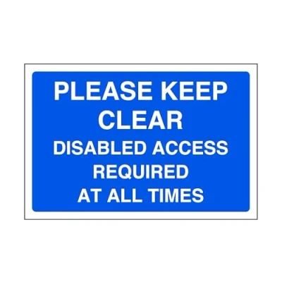 Please keep clear disabled access required at all times - parking sign - disable signage - Indoor/outdoors Safety Sign to meet legal obligations and foster compliance. Highly durable, 3mm Dibond aluminum. Rust-free, waterproof, and windproof. Ideal for indoor and outdoor use, offering resistance to corrosion and damage. Ensures longevity and quality signage. Measuring 300mm x 200mm, our sign ensures optimal visibility when mounted at eye level for viewing within 7 meters, effectively enhancing safety and communication on the road network This sign conforms to EN ISO 7010:2012 standards, featuring a centrally positioned black pictogram or text against a contrasting background, ensuring clear communication and adherence to safety regulations Experience peace of mind with our 4-year warranty for indoor and outdoor use. We're dedicated to quality, ensuring durability and reliability in every product. 10mm radius corners, our signs ensure safety during post-mounting, eliminating sharp edges and reducing accident risks, thereby prioritizing safety in all installations