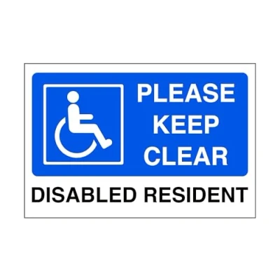 Please keep clear disabled resident parking signs High tack self adhesive sticker (400mm x 300mm) Viewing Distance within 14m.