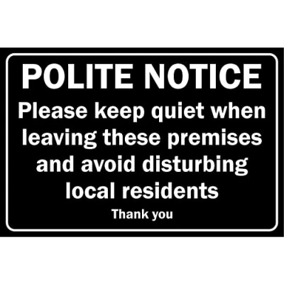 Please keep quiet when leaving these premises and avoid disturbing local residents sign Self adhesive sticker Digitally printed and laminated for extra durability Remove backing film and apply to dry, smooth, oil free surface.