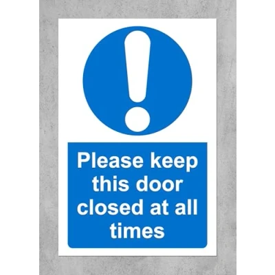 Please keep this door closed at all times Safety sign 1mm Plastic sign Digitally printed for extra durability Drill and screw in position or use double sided tape to mount onto suitable surface.