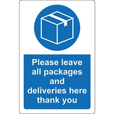 Please leave all packages and deliveries here safety sign Self adhesive sticker 200mm x 150mm Digitally printed and laminated for extra durability Remove backing film and apply to dry, smooth, oil free surface., Manufacturer: KPCM Display ltd
