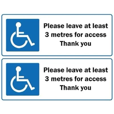 Please leave at least 3 metres for access Disabled car sign Pack of 2 Self adhesive stickers 200mm x 78mm Digitally printed and laminated for extra durability Remove backing film and apply to dry, smooth, oil free surface.