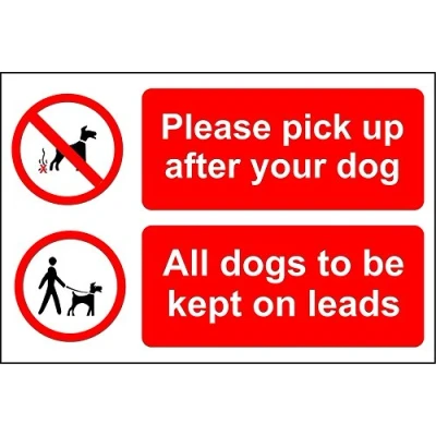 Please pick up after your dog. All dogs to be kept on leads sign 3mm Aluminium sign 300mm x 200mm Digitally printed and laminated for extra durability 10mm Radius rounded corners, no sharp edges