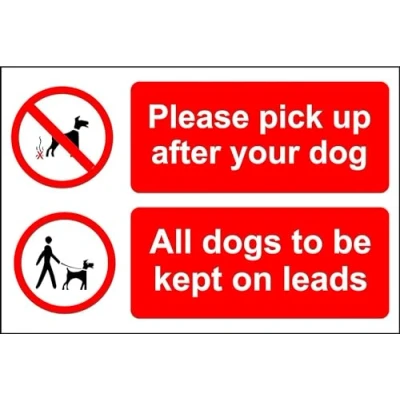 Please pick up after your dog. All dogs to be kept on leads sign 3mm Aluminium sign 300mm x 200mm Digitally printed and laminated for extra durability 10mm Radius rounded corners, no sharp edges