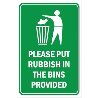 Please put rubbish in the bins provided. Self adhesive sticker. Printed using the latest digital technology and laminated for extra durability. Remove backing film and apply to dry, smooth, oil free surface. All signs come with a 5-year warranty. All our signs are UV resistant meaning they will not fade in sunlight. Our vinyl stickers are temperature resistant from -40°C to +80°C.