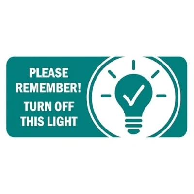 Please remember! turn off this light eco sign. Self adhesive sticker. Printed using the latest digital technology and laminated for extra durability. Remove backing film and apply to dry, smooth, oil free surface. All signs come with a 5-year warranty. All our signs are UV resistant meaning they will not fade in sunlight. Our vinyl stickers are temperature resistant from -40°C to +80°C.