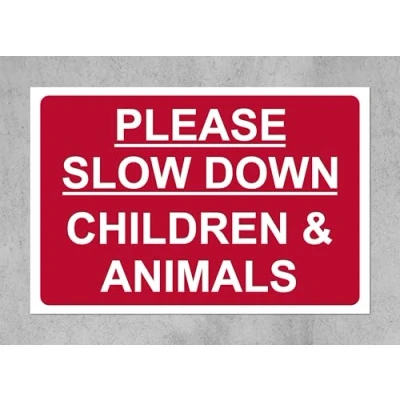 Please slow down children and animals Safety sign 3mm Aluminium sign Digitally printed and laminated for extra durability 10mm Radius rounded corners, no sharp edges