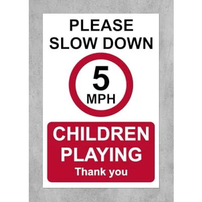 Please slow down children playing 5mph thank you Safety sign 3mm Aluminium sign Digitally printed and laminated for extra durability 10mm Radius rounded corners, no sharp edges