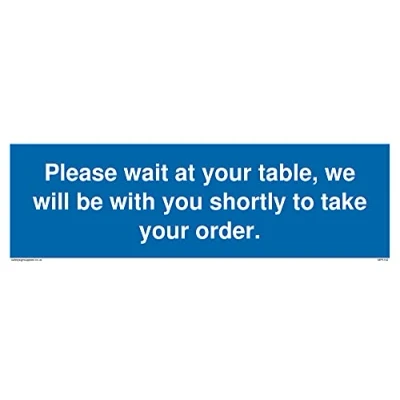 No Symbol This sign is made from vinyl high tack A stickier sticker. Uses a stronger adhesive to make it more suitable for plastic surfaces like Wheelie Bins or where the sticker might get rubbed. 31 landscape Sign Text: Please wait at your table, we will be with you shortly to take your order.