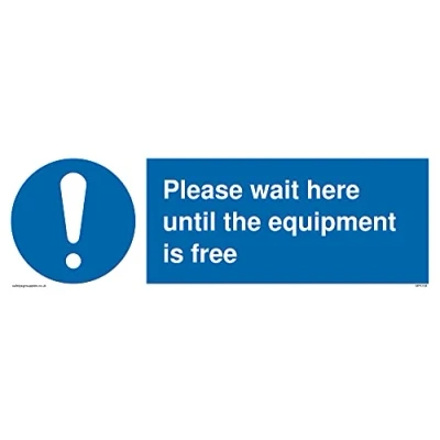 M001 : General mandatory action This sign is made from vinyl high tack A stickier sticker. Uses a stronger adhesive to make it more suitable for plastic surfaces like Wheelie Bins or where the sticker might get rubbed. 31 landscape Sign Text: Please wait here until the equipment is free