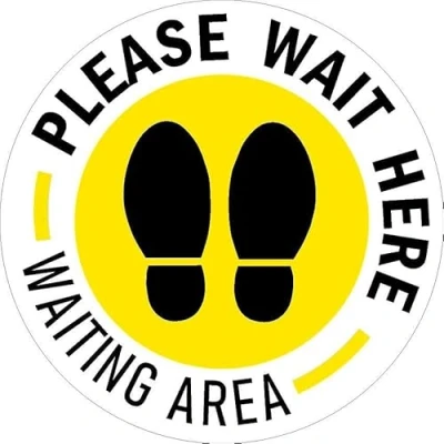 Please wait here, Waiting area, floor sticker. Self adhesive floor graphic. Fitted with an anti slip heavy duty over-laminate to prevent slips. All signs come with a 5-year warranty. All our signs are UV resistant meaning they will not fade in sunlight.