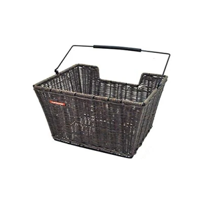 Mounts to Rear Pannier Rack using Pletscher Easy-Fix bracket suitable for all Pletscher Easy-Fix Racks Integrated handle with soft rubber coated grip for comfortable transportation off the bike Wood effect composite "rattan" weave Suitable for use with pletscher basket insert Large Capacity - 330x250x220mm