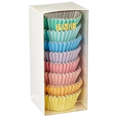 Carefully selected pantone colours Foil lined to prevent grease discolouring the cases Standard size: 50mm Base, 70mm top, 28mm Height For best results use with PME muffin/ cupcake pans Paper box with recyclable PET front lid