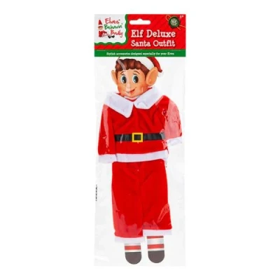 Dress your naughty elf up in true festive style with this Deluxe Elf Santa Outfit. Featuring a soft, plush fabric, this Santa outfit is perfect for putting your Elf character into and getting him in some festive mischief!. 1 x Elves Behavin' Badly Elf Deluxe Santa Outfit. Plush fabric. L 26cm x W 12cm. Create fun scenes with your elf. Made to fit our Elves Behavin' Badly Boy and Girl!