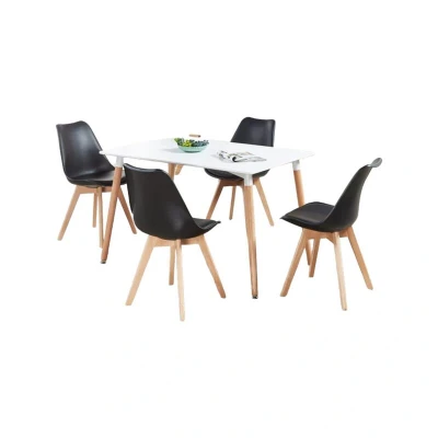 General description The highly recommended Scandinavian-style Lorenzo dinette set includes a modern rectangular white dining table and a set of 4 black dining chairs. This padded kitchen set will match any room due to its classic design, providing a sophisticated touch to your furniture. The sturdy kitchen chairs feature padded faux leather seats for a comfortable sitting experience, making it a practical and modern seating solution for your home. Technical specifications Table Dimensions: Height: 75 cm, Depth/Length: 120 cm, Width: 80 cm Chair Dimensions: Height: 83 cm, Depth: 44 cm, Width: 48 cm, Seat Height: 46 cm Other information The legs and feet of the chairs are covered with end caps to protect your floor from scratching, while also providing anti-slip and anti-noise features, enhancing stability. Perfect for kitchen storage, dining rooms, living rooms, and more.